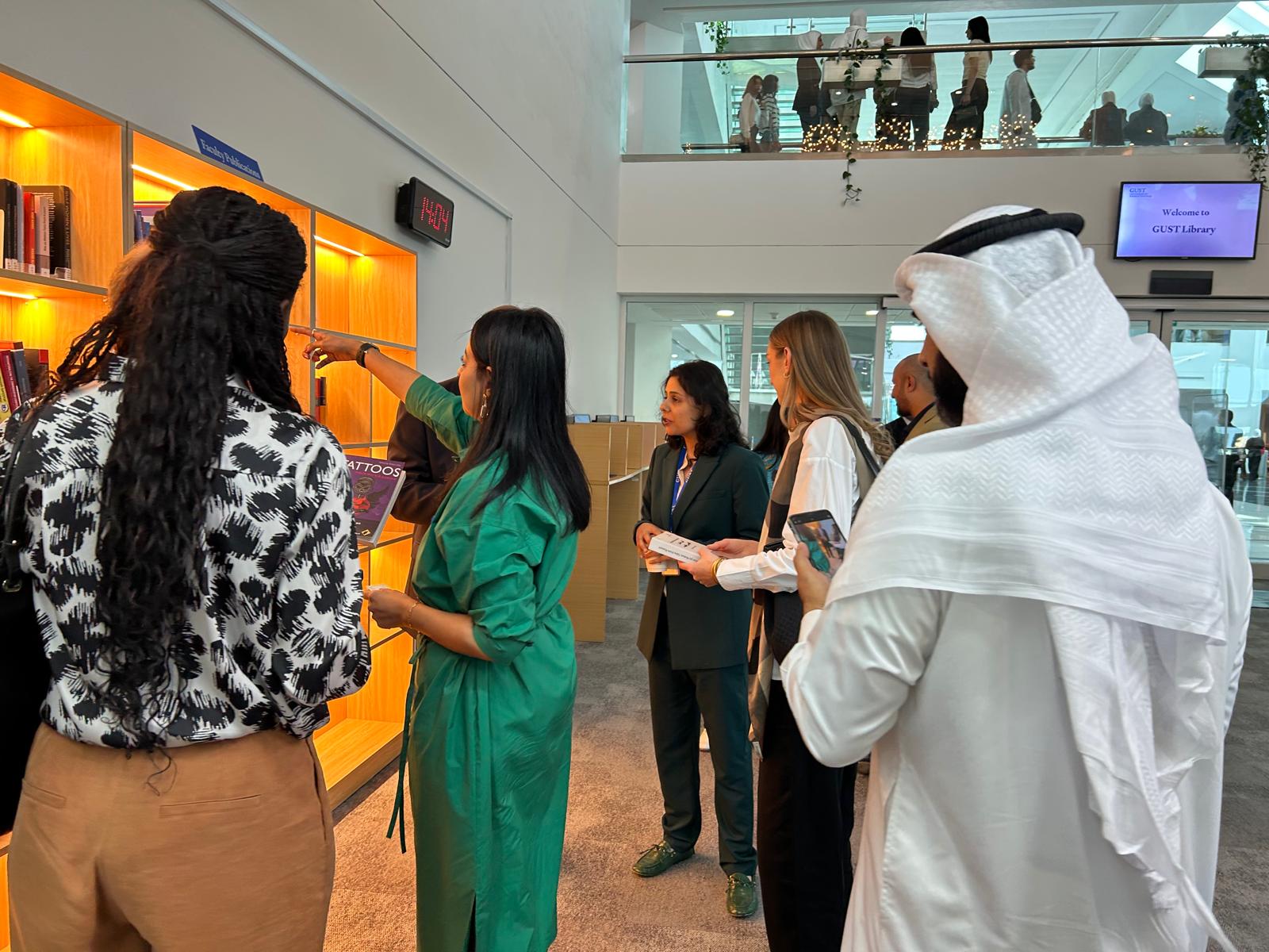 The delegation was welcomed and guided by Ms. Wadhhah Ahmed, Library Acting Manager, who showcased several highlights including the Faculty Publications Corner, Embassy Collections, and the innovative technologies adopted to enhance access to GUST’s academic resources and thematic collections.